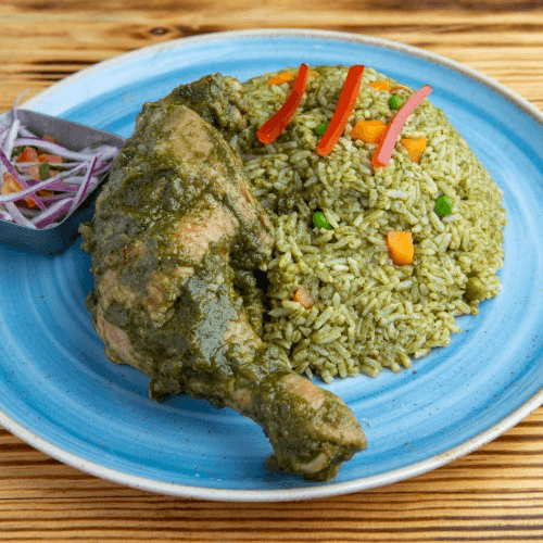 Porkbelly with sweet and sour sauce, green rice made with cilantro and garlic and Peruvian yellow pepper. Garnished with peas and Peruvian creole sauce