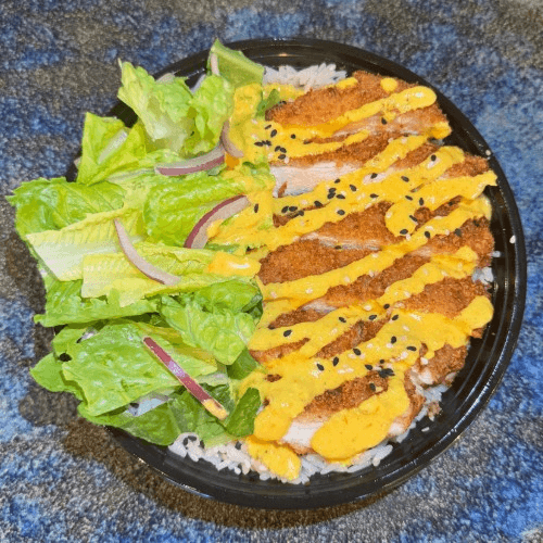 Jasmine rice, spicy mayo, panko-fried shrimp with sweet and sour sauce