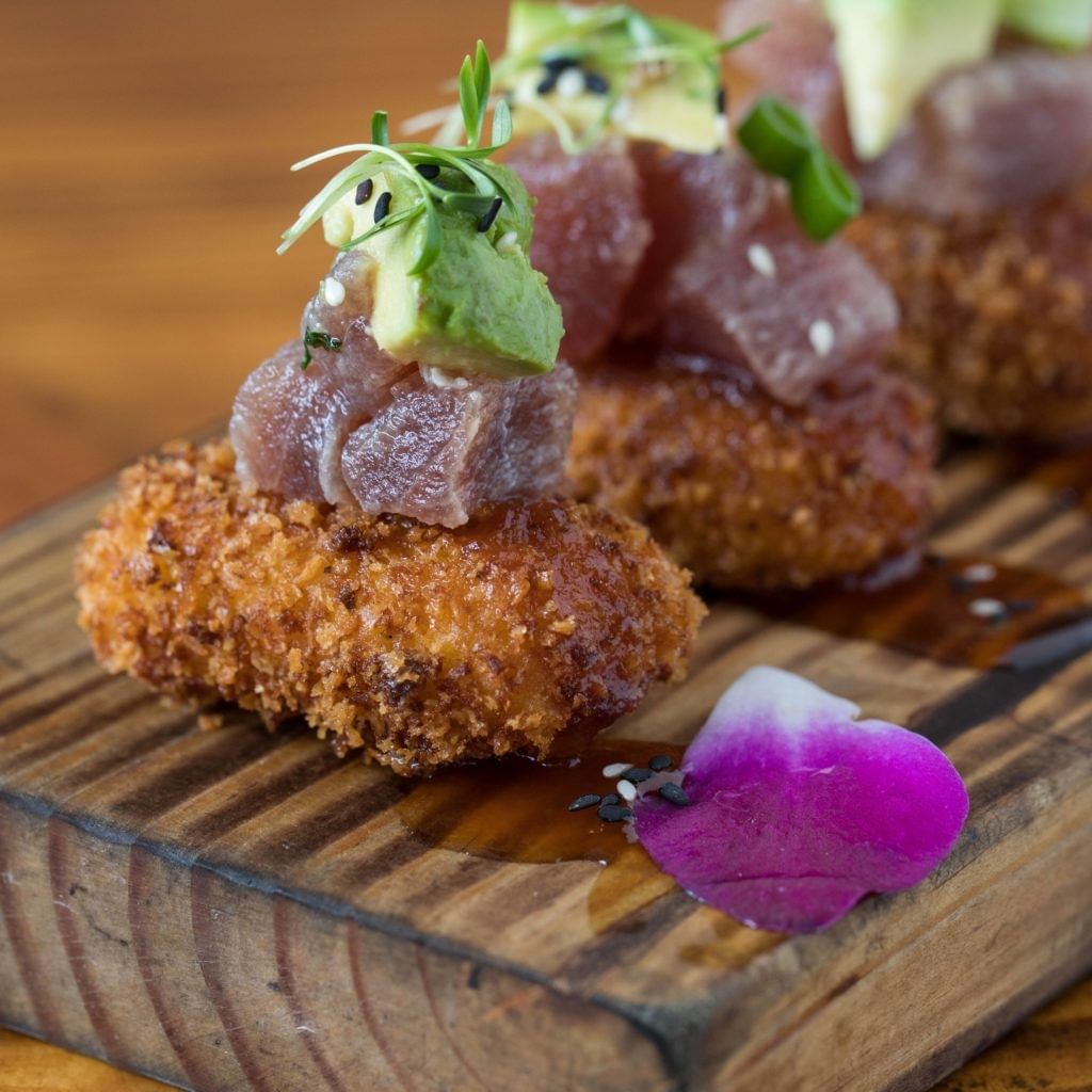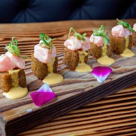 Lightly fried causa with tuna Nikkei ceviche and sweet and sour sauce