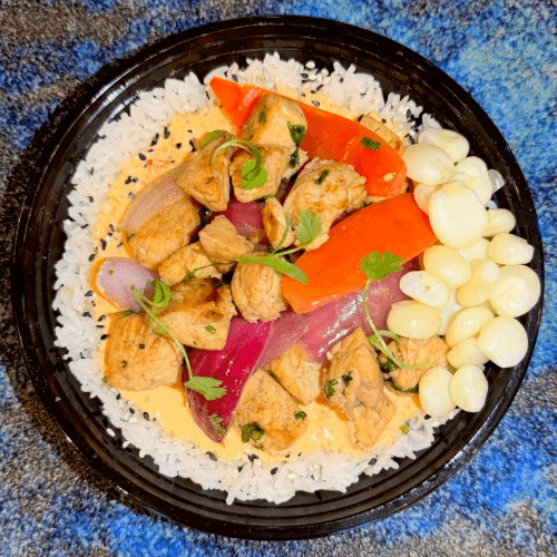 Jasmine rice, spicy mayo, chicken stir-fry with tomato, onions, soy sauce, vinegar and cilantro, peruvian giant corn