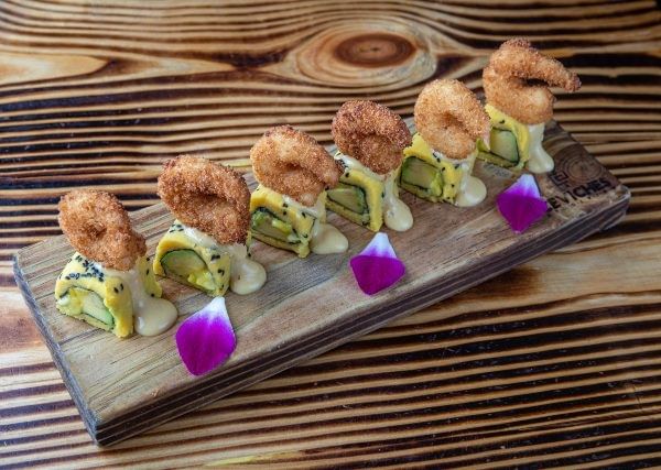 Panko shrimp, avocado, and sweet potato. Topped with small ceviche, and acevichado sauce