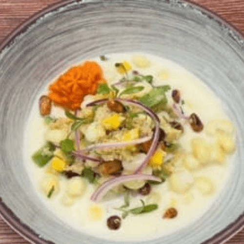 Fish ceviche served with hot leche de Tigre. Marinated lightly in lime juice and seasoned with Peruvian limo chili, fresh cilantro, and onion, garnished with sweet potato, and choclo (Peruvian giant corn)