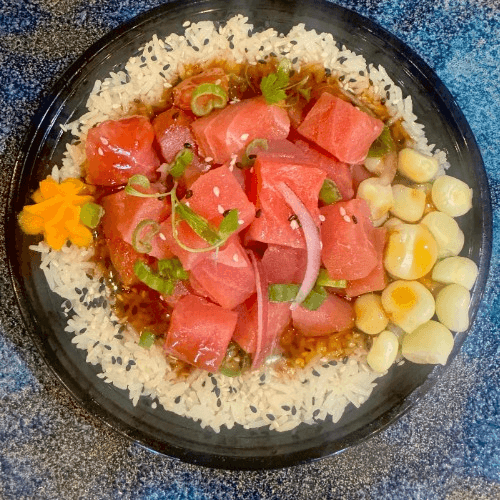 Jasmine rice, sweet and sour sauce, tuna ceviche, green onion, peruvian giant corn, sweet potato