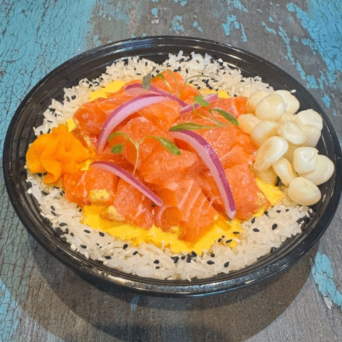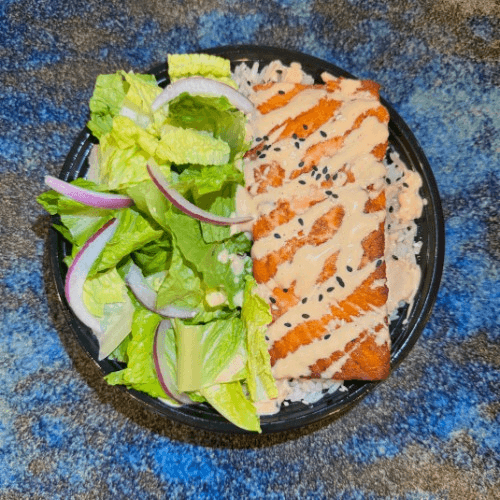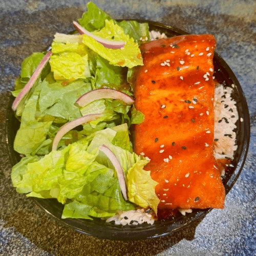 Jasmine rice, grilled salmon with spicy mayo, romaine lettuce, ginger dressing