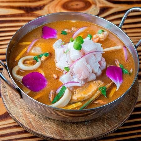 Seafood and corvina soup with Peruvian Panca pepper, garnished with fish ceviche
