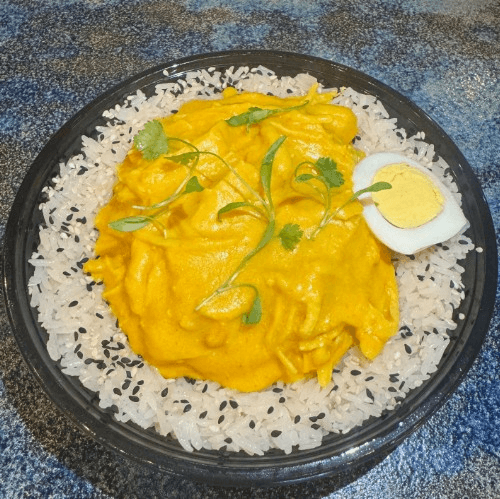 Jasmine rice / creamy chicken stew made with shredded chicken and peruvian yellow chili pepper / boiled egg